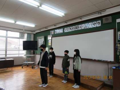 今日の1時間目、リモートで児童会朝会を行いました。本部委員会の児童が進行し、各委員会から劇やクイズなどで活動内を他学年に発信しました。低学年のみんなも、5・6年生の児童が委員会活動でどんなことをしているのかが分かった様子が見られました。これからも、よりよい学校づくりをするために委員会活動を進めていってください。