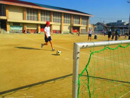 一人ずつボールを持って、ゴール目指してキック!