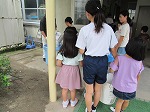 もくもく「なかよし掃除」では、6年生や5年生が 低学年にほうきなど、道具の使い方を教えていました。ゴミを捨てる時は「お願いします。」と言って管理用務員さんにゴミ箱を渡すことも教えていました。