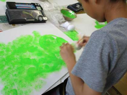 「おはなしからうまれたよ」の学習では、お家で用意していただいたタンポを使って絵の具で背景を塗りました。楽しみながら活動でき、すてきな背景が出来上がりました。完成が楽しみです。