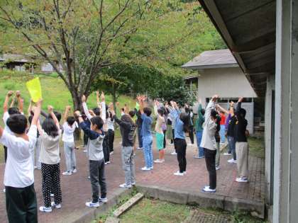 体操をして体を目覚めさせます。