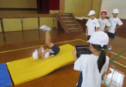 体育科の学習でマットあそびを行いました。マットを並べて様々な場を作り、自分のめあてにそった場所で学習を行いました。タブレットを使って、技を調べたり、動画で撮影したりして、楽しく取り組むことができました。