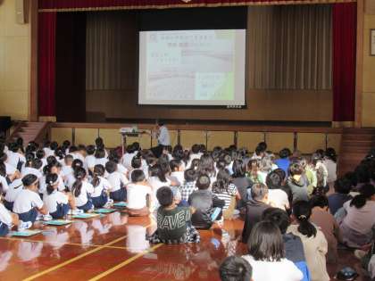 今日は紫明小学校の93歳のお誕生日です。紫明小学校は、1930年 室町小学校の児童が増えたため第二室町小学校としてスタートしました。戦争のころの様子や、一番児童が多かった1960年ごろの運動会の様子など、写真を使って校長先生に教えていただきました。校長先生からは、これからも全学年の児童が仲の良い学校をつくりましょうとお話がありました。
