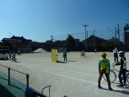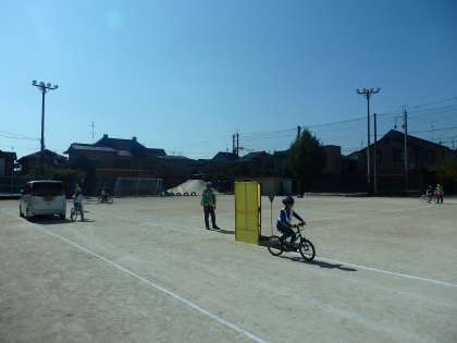 警察署の方やボランティアの方々にお世話になり、自転車教室をしました。「自分の命は自分で守る」ために、あらゆる方向を見て確認することが大切だと教えていただきました。自動車が来ないか確認したり、止まれの標識を見て一時停止したり、実際に乗って体験しました。これからも自転車に乗るときは、交通ルールを十分意識して乗ってほしいです。