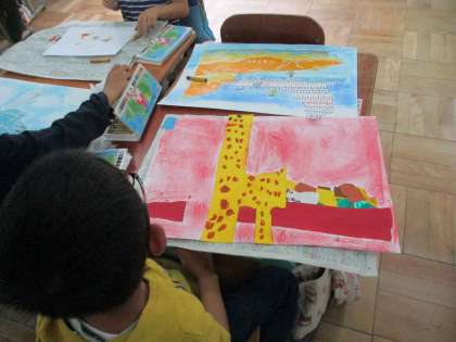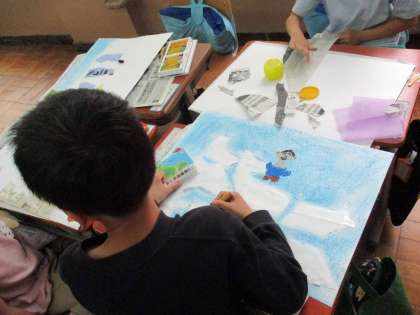 図画工作科の学習では、お家で集めていただいた包装紙やチラシを使って、紙をやぶいて作品作りをしました。子どもたちは、やぶいてできた偶然の形から、想像力豊かに描いていました。