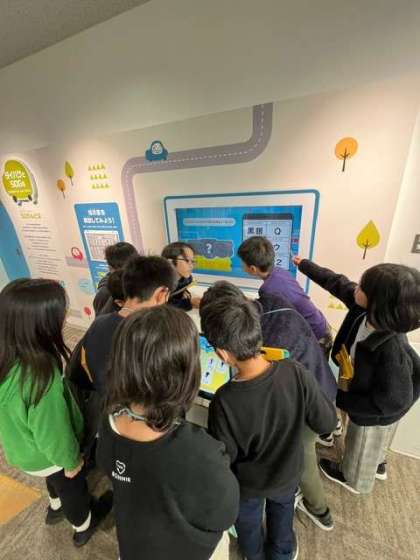 ダイハツ工業のことをちょっぴり学習した後に、二手に分かれて、展示物の見学や体験、実際の車両を見ながら検査クイズに挑戦しました。