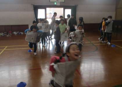 体に新聞を付けて走ったり、ボーリングをしたり、縄跳びををしたり、