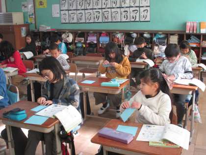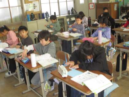 子どもたちは教科書に印をつけながら聞いていました。