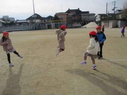 音楽科の学習では、日本の昔から伝わるわらべうたにみんなで親しみ、遊んでいます。今日は、「おおなみこなみ」をみんなで歌い、大繩で遊びました。ほかにも、知っているなわとびうたを教え合い、楽しく活動する様子が見られました。