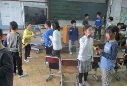 音楽科では「がっきで おはなし」の学習で、自分のお気に入りのリズムを好きな楽器を用いて、リズム打ちをしました。まず、ロイロノートでリズムを組み合わせて、お気に入りのリズムを作り、覚えました。そして、2人1組になり、お気に入りのリズムをお話をするように鳴らしました。