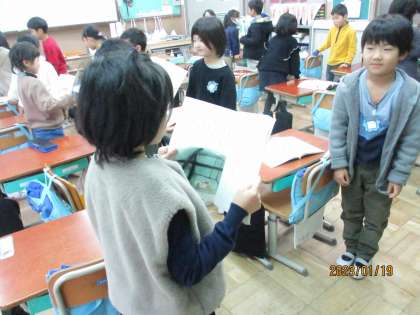 「たぬきの糸車」を読み深めてきて、声に出して読みたい場面を選び、工夫して音読をし合いました。声の大きさや動きなど、友達の音読の良いところをたくさん見つけられていました。