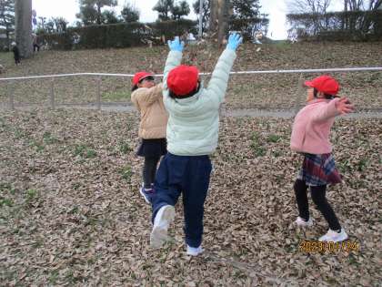 冬の季節の移り変わりを見つけに、賀茂川へ出かけました。風の冷たさや、落ち葉の心地よい音など、体全体で冬を感じられました。学校で作った凧もあげて、元気いっぱい体を動かして寒さを吹き飛ばしていました。