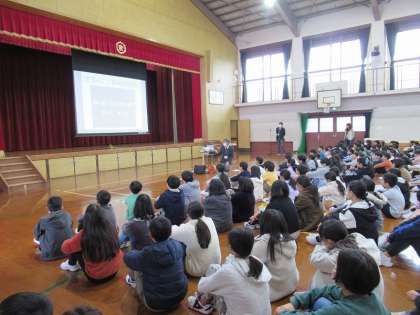今日は、校長先生から本校の目標と同じ「ともに」という題名が付いた音楽を紹介していただきました。この作者は、熊本の出身者で、熊本で地震が起こった際、自分にできることは何かないかと考え、この曲を作られたことも紹介してくださいました。歌詞の中に「不安な気持ちがあっても、くじけず前に進めば幸せになる」「共に頑張ろう」「熊本にいる友に」という意味があることも教えてくださいました。子ども達は、体育館に流れる音楽にしっかり耳を傾けていました。最後に、「紫明小学校の『ともに』の目標も、周りに誰がいないと絶対にできない目標です。一人では無理です。残り少なくなった今の学年での学校生活をがんばってください。」と話されました。