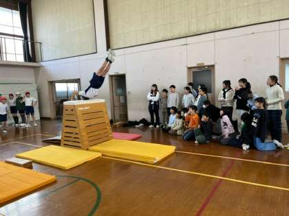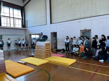 7段や8段で台上前転やかかえ込み跳び、頭はねとびをどんどん成功する5年生に、4年生は「お〜!」「すごい!」「なんでできるん?」という言葉とともに拍手をくれました。5年生はとってもうれしそうで、はりきって技を披露していました。