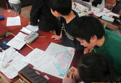 「もっともっとまちたんけん」の学習では、お店や施設などにインタビューして聞きとったことをみんなにも知らせたいということで、どんなことを詳しく知らせていきたいか、ピラミッドチャートを使って話合いを行いました。それぞれのグループの1番の秘密は何についてなのだろうかと、活発に意見を出し合う姿がみられました。いい発表になるように頑張ってほしいです。