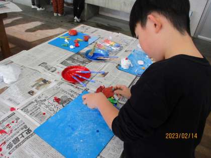 「ごちそうパーティー はじめよう!」の学習で、先週紙粘土で作ったごちそうに絵の具で色を塗りました。