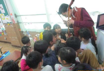 冬がとても長く寒いこと、国の人口が京都府とあまり変わらないこと、移動式住宅ゲルに住んでいるということなど、モンゴルの伝統や文化などにも詳しく教えていただきました。「スーホの白い馬」に出てくる馬頭琴も見せてもらい、実際に弾いた音色を聴くことで、「すごい!」「いい音だなー!」と教室のあちこちで歓声が上がりました。