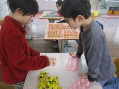 100を超える数について学習しました。たくさんある積み木を、実際に数えてみました。
