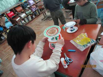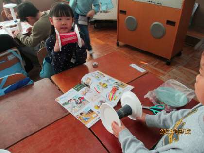 「かみざらコロコロ」という単元で、身近な材料を使って転がるおもちゃを作りました。材料の組み合わせ方を工夫して、よく転がるように何度も試しながら作っていました。作ったおもちゃで、次は外で転がして遊びます。