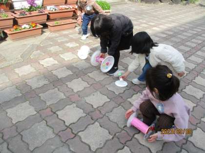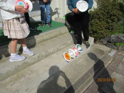 図画工作科の学習でつくったおもちゃで、今日は外に出て冬の冷たい風にのせておもちゃを動かして遊びました。どちらが遠くまで転がるか勝負したり、滑り台のように角度をつけて勢いよく転がしたりと、工夫して遊ぶことができました。