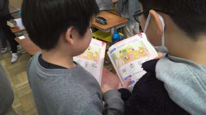 この日は、教科書に物のシールを貼って、お互いに尋ねる活動をしました。