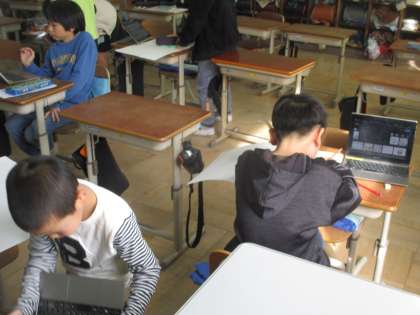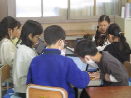 それぞれが調べた情報を持ち寄り、相談しているグループ。