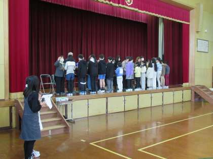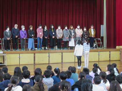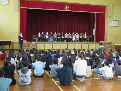 令和5年度 学校ボランティアとしてお世話になった 読み聞かせの方、紫明セーフガードの方、部活動でお世話になった方、お花を生けていただいた方へお礼の気持ちを伝える会を、全校児童で行いました。1年生が作ったメダル、2年生から4年が手分けして作った折り紙花束、5年生・6年生がメッセージを書いて作った色紙を渡しました。今年度もたくさんの方にお世話になりました。ありがとうございました。