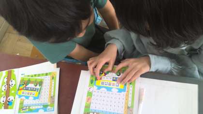 2年生のおさらい!ということで、授業のはじめにみんなで九九を暗唱しました。そのあと、九九の表を使ってペアで答え当てゲームを楽しみました。かけ算の答えがいくつずつ増えているのかに目をつけて、よく考えて問題を出し合い、答え合っていました。