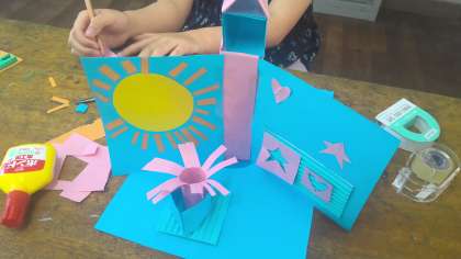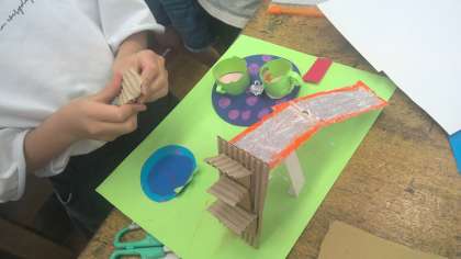 割ピンを使って、くるくる回る工作に取り組んでいます。子ども達の発送はとっても豊かです。プール、地球、ロケット、すべり台、いろんなものがかわいらしくくるくる回っています。海と山、地球、噴火山など、ダイナミックな舞台が回っている作品もあります。「割ピンを使って回す」という仕組みに子ども達は大変驚いたようで、「やってみたい!」とやる気満々でした。