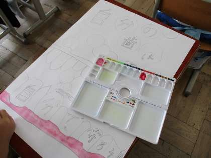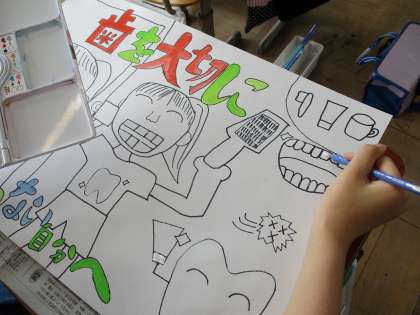 歯のポスターの色を塗り始めました。文字を強調したり、自分がアピールしたいところを目立たせたりする様子が見られました。