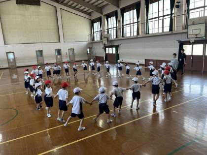 体育の授業で「タタロチカ」というロシアのフォークダンスを踊っています。子どもたちは音楽に合わせて軽快にステップをふむことができました。踊りの最後には「ヤクシー!」(日本語で「最高」という意味)と掛け声を出すことができました。
