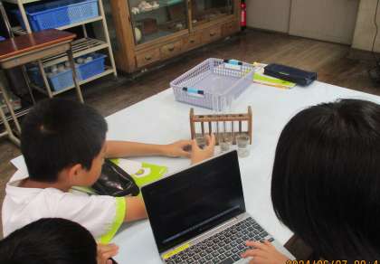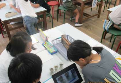理科の学習では、土の種類と水のしみこみ方にはどんな関係があるのか、実験をしました。校庭の砂、砂場の砂、じゃりの3種類の砂が入ったペットボトルの容器に、同時に水を注ぎ、しみこみ方を調べるというものです。実験をすると、「やっぱり予想通りやった。」「こんなにしみこみ方が違うんだ。」という声などがたくさん上がり、分かりやすい実験結果が出て、各グループの実験は成功に終わりました。