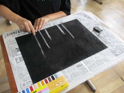 コンテの黒を使って、画用紙を塗りこめていきました。手が真っ黒になっている子もいました。その後、消しゴムで力の入れ方や手の動かし方を変えていろいろな線や形をかいていきました。