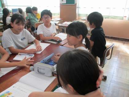 自分の考えをきちんと相手に伝えるために、まず理由を明確にして、自分がなぜそちらを選んだのかを話し合いました。今回は、旅行に行くなら、山か海を選んで対話をしました。活発な意見交流が行われていました。