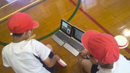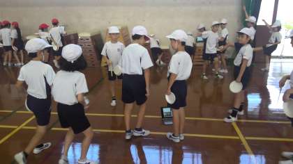 動きの細かいところや難しいところは、グループごとにGIGA端末で動画や説明を見て確認しています。4年生が先輩らしくリードしてくれて、頼もしいです。3年生も一生懸命に手足を動かしています。