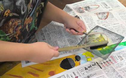 水に溶いた絵の具を塗った金網をブラシでこすったり