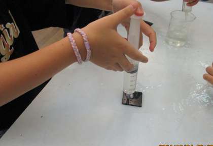 理科の学習では、閉じ込めた空気や水は押すとどのようになるのか、実験を行いました。前回の授業では注射器に空気を閉じ込め、注射器を押すことで、空気は体積が小さくなることが分かりました。