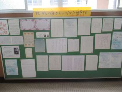 14日に地域で行われた「紫明学区敬老の会」で本校の代表児童が渡しました。その後、学校にお返事をたくさんいただいています。今日は敬老の会実行委員長が全校児童にお礼を言いに来てくださいました。いただいたお手紙は、職員室前に掲示しております。