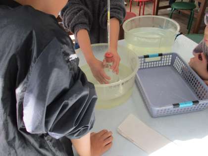フラスコを温めると、ガラス管に入れたゼリーが大きく上に移動し、「すごい!」「めっちゃ動く!」と歓声を上げながら実験を楽しむ姿が見られました。実験を通して、空気は冷やすと体積が小さくなることに気付くことができました。
