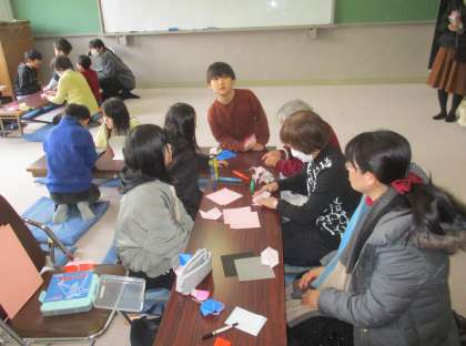 総合的な学習では、高齢者の方々を笑顔にするために、「すこやかフェスティバル」を企画しました。地域にいらっしゃる高齢者の方と、様々な出し物を催し、交流しました。最初は、うまく説明できるかや、高齢者の方たちが楽しんでくれるか、など不安な声も多かったですが、大変賑やかで楽しい交流会となりました。高齢者の方達にかるたや、ボーリング、折り紙などといった出し物で遊んでもらい、楽しんでいただけたと思います。終わってから、「またやりたい!」「楽しかった!」という声も多く、交流会は大成功に終わりました。