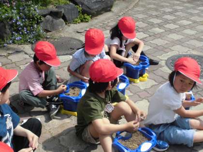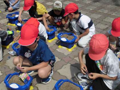 1年 生活「さいて ほしいな わたしの はな」アサガオの種を植える