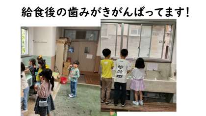 給食後の歯みがきを毎日しています。お昼の歯みがきタイムに合わせて。「歯ッピーはっちゃん」が流れます。曲に合わせてリズムよく歯みがきができたらいいですね。