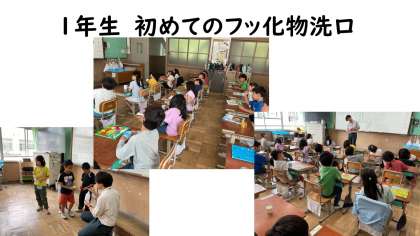1年生はフッ化物洗口が始まりました。今日は初めてのフッ化物洗口で、みんな真剣にうがいをしていました。右に左に、上手にできていましたよ。