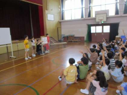 ひまわり学級と3年生の交流学習があり、学級紹介やクイズ、ゲームなどを一緒に行いました。その中でも、「ひたすらオセロ」は大盛り上がり。ひまわり学級と3年生が力を合わせながら協力して楽しむことができました。「一緒に過ごせて良かった」「明日、ひまわり学級の友達と遊ぼうかな」などの声もあり、温かく素敵な会となりました。