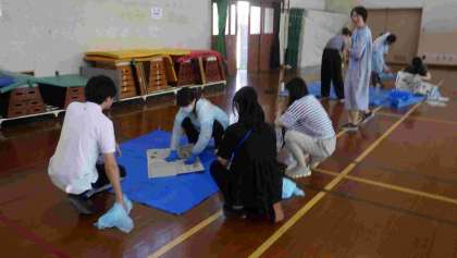 養護教諭から感染性胃腸炎について基礎知識や嘔吐物処理の方法についての話を聞いた後、「教室において児童が嘔吐をした」という場面を想定した演習を行いました。