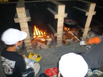 1日目の夕食は「野外炊事場」で作りました。かまど班,調理班に分かれて,自分たちのご飯を作ります。