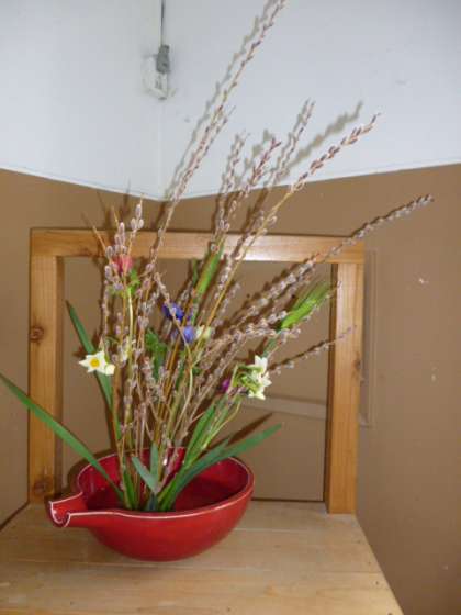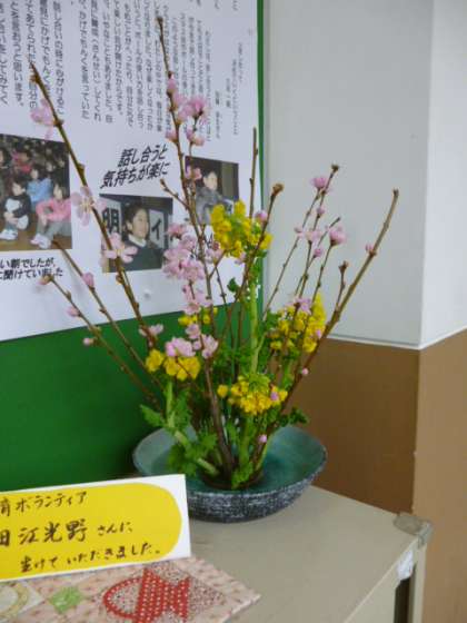 立春を過ぎたとはいえ、まだまだ寒い毎日です。今回も、教育ボランティア(華道)さんにお花をいけていただきました。階段の踊り場、職員室の横、手洗い場の横に、春が訪れました。