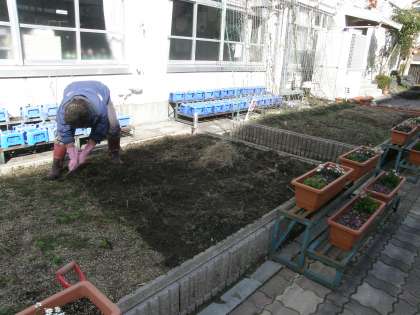 毎年入学式の頃,紫明小学校の花壇にはたくさんのチューリップが咲き誇ります。でも,放っておいて勝手に咲くのではありません。それにはきちんとした準備が必要です。天気の良い今日の昼下がり,管理用務員さんが硬くなった土を掘り起こして植えやすいようにしてくださっていました。さて,この4月にはどんな色のチューリップが咲くのでしょうね。