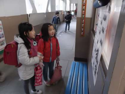 廊下から「あたりまえ〜あたりまえ〜あたりまえ朝ごはん」と上手な歌声が聞こえてきました。児童朝会で健康委員会が発表した朝ごはんの歌と体操を,掲示版を見ながら歌っている子どもたち。はじめは2人だったところに次々と集まってきて,リズムよく歌っていました。健康委員会の取組が子どもたちにひろっがています。嬉しいな〜。