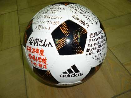 今年度,サッカー部活はボランティアの谷内さんにお世話になりました。毎週,熱心にサッカーを教えていただきました。そこで,感謝の気持ちを伝えるために,みんなでサッカーボールに寄せ書きをしました。子どもたちの思いがこもったボールを明日の交流会でボールをプレゼントできたらと思います。